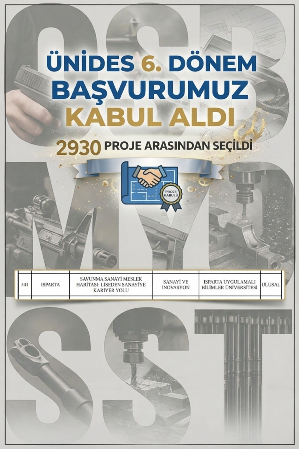 Okulumuz Silah Sanayi Teknikerliği Programı öğretim üyelerinden Öğr. Gör. Dr. Osman Saltık önderliğinde hazırlanan "Savunma Sanayi Meslek Haritası: Liseden Sanayiye Kariyer Yolu" başlıklı projemiz 2930 proje başvurusu arasından kabul görülerek desteklenme hakkı kazandı. Bu başarıda emeği geçenleri tebrik ederiz..